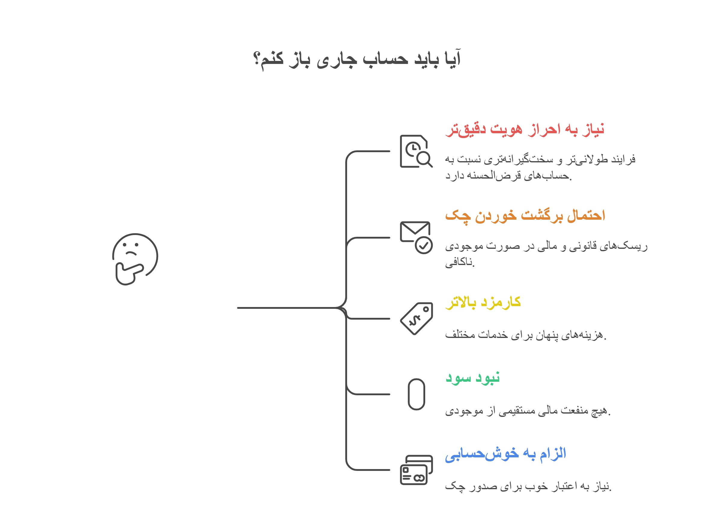 قبل از اینکه به فکر افتتاح حساب جاری بیفتید، بد نیست نگاهی هم به محدودیتها و چالشهای آن بیندازید. حساب جاری ابزار خوبی برای مدیریت مالی و انجام تراکنشهای روزمره است، اما مثل هر ابزار دیگری، نقاط ضعفی هم دارد که قبل از تصمیمگیری باید بدانید. شناخت این معایب به شما کمک میکند بهتر تفاوت حساب جاری و قرضالحسنه را درک کنید و انتخاب درستتری داشته باشید.