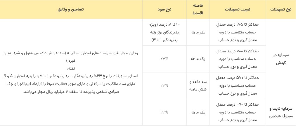 | بانک سرمایه | نسیم پذیرندگان | حقیقی: تا ۲۰۰ / حقوقی: تا ۵۰۰ میلیون | وابسته به رتبه اعتباری | ۳ تا ۶۰ ماه | حداقل ۱ ماه فعالیت، رتبه A تا C |